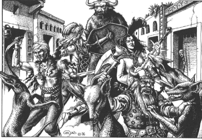 Dann jedoch hatten wir Pech. Wir sahen eine Gruppe aus 25 Ferkinas und 25 Novadis. Dass diese zusammen ritten, war schon ungewöhnlich. Als wir aber auch vier in Kutten gehüllte Gestalten sahen, die wir alsbald als archaischen Kriegs-Golems identifizierten, ahnten wir, dass wir es auf einen Räuberzug der grauen Eminenz gestoßen waren. Denn unseres Wissen war es nur diesem Feind neben uns gelungen, die Golems aus den geheimen Lagern der diamantenen Sultane zu finden und zu aktivieren. Das war schlimm. Schlimmer war, dass sie nur eine halbe Stunde von uns entfernt waren. Noch schlimmer wurde es, als Nim mit Hilfe ihres Wolfes entdeckte, dass ein weiterer Trupp sich bereits um die Stadt geschlichen hatten. Es waren mehr als 20, wieviel konnten wir nicht erkennen. Sie schienen aber hundsgroße Tiere dabei zu haben. Was dies genau war, konnten wir allerdings nicht erkennen. Anscheinend hatte die Eminenz geplant, das es ein ausgezeichneter Zeitpunkt war, seine Herrschaft über den Mhanadi zu erweitern. Nun ja, dies war der Fall, wo Hasrabal mit unseren Truppen in einem wütenden Kampf östlich der Gorischen Wüste verkeilt war und dort auch Tungdil und eventuell Marek gebunden waren.